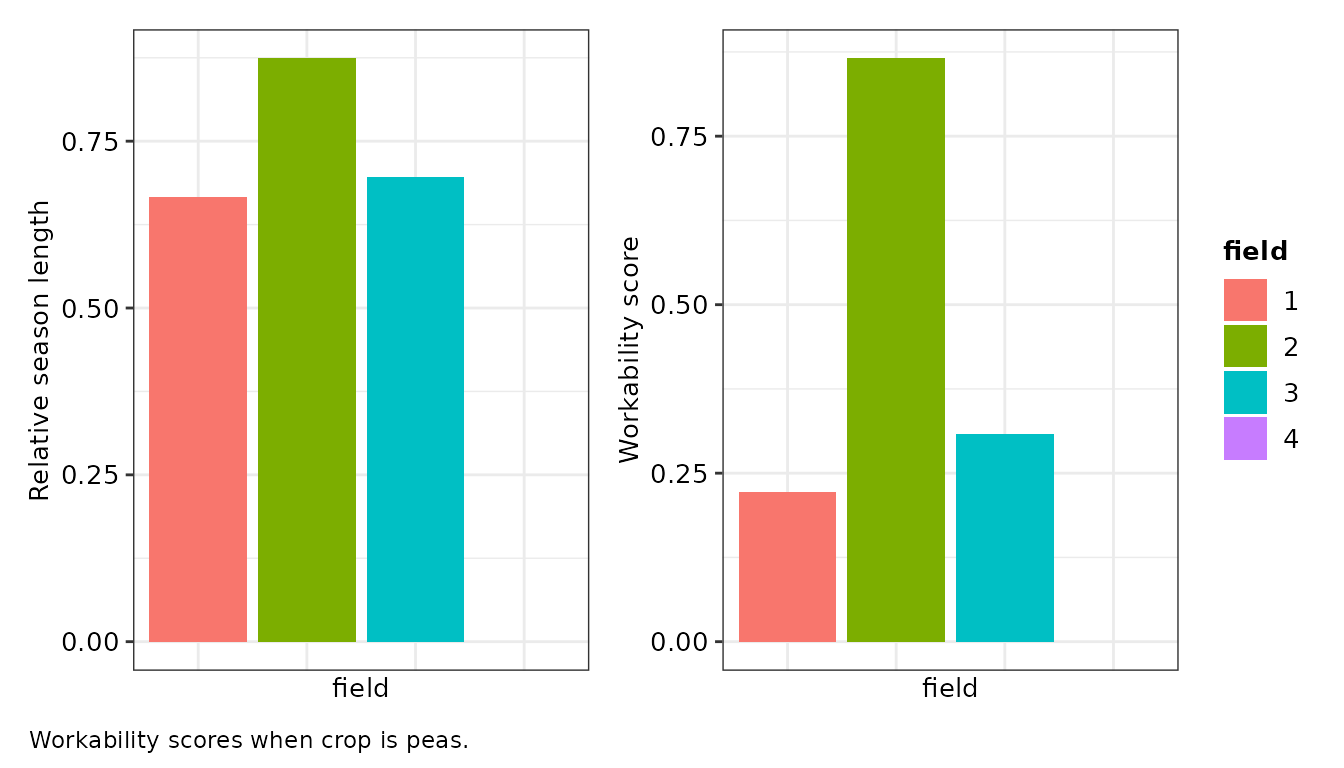 The relative season length, and in extension, the indicator score, are a function of the soil and hydrological properties of the field as well as the growing season and soil working depth requirements of the crop. By choosing a crop with a shorter growing season and or more shallow soil working depth, the score can be improved. Lets see how these parcels perform when we cultivate peas.