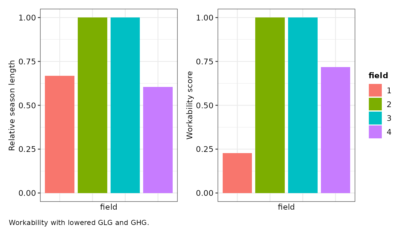As you may have suspected, lower water levels resulted in higher relative growing seasons and workability scores. Note that for the function ‘workability’ lower ground water is always positive until the relative growing season length equals 1. However, low groundwater levels can be negative for other soil functions.